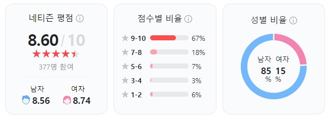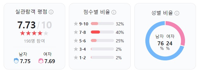 네이버에서 실관람객 평점은 8.49점, 네티즌 점수는 9.14점으로 나타났어요. 비록 조금씩 낮아지는 추세지만, 여전히 높은 평가를 받고 있죠.