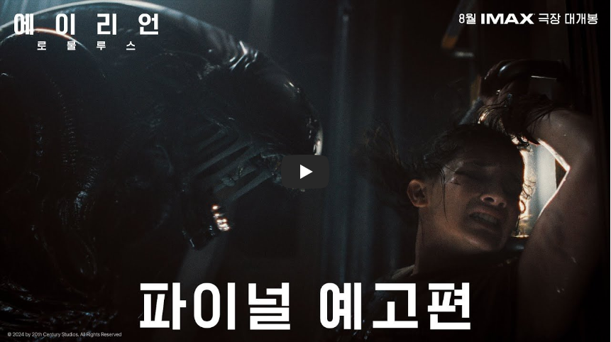 ⦁소개 : 2142년, 부모 세대가 맞닥뜨렸던 암울한 미래를 피하려는 청년들이 더 나은 삶을 찾기 위해 식민지를 떠날 계획을 세운다. 하지만 버려진 우주 기지 ‘로물루스’에 도착한 이들은 악몽과도 같은 에이리언의 무자비한 공격에 쫓기기 시작한다. 그 누구도 그들의 절규를 들을 수 없는 우주 한가운데, 생존을 위한 치열한 사투를 벌여야 하는데... 폐쇄된 공간에서 펼쳐지는 압도적인 공포를 느껴라!
