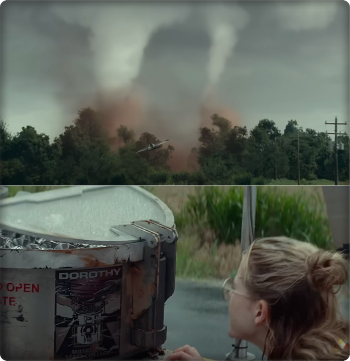 - 여주인공은 토네이도에 가족을 잃고 슬픔 속에 살아가던 중, 그런 그녀 앞에 옛 친구 ‘하비’(안소니 라모스)가 찾아와 토네이도를 소멸시킬 수 있는 획기적인 방법을 제안한다. 고민 끝에 합류하게 된다.